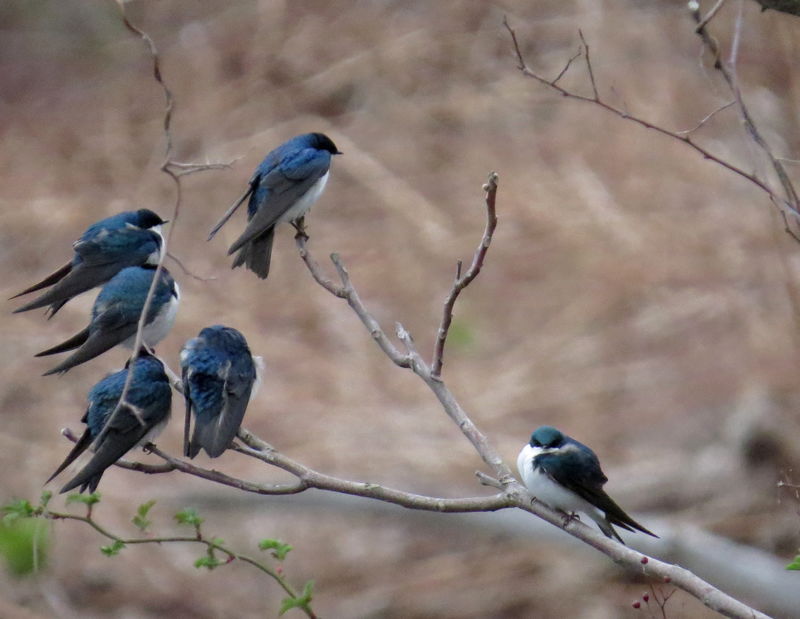 Swallows will occasionally flock together. In the second of these photos, notice a barn swallow comfortably sitting among the tree swallows. A Northern Rough-winged swallow also stood out among the blue feathers on this same busy tree.