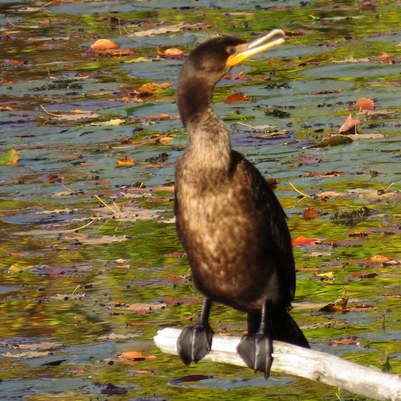 Though this bird belongs to the double-crested cormorant species, the double crests appear only on breeding adults. This one, without the dramatic tufts on top, must be a non-breeding adult. The photo at bottom offers a rare close-up of cormorant feet!