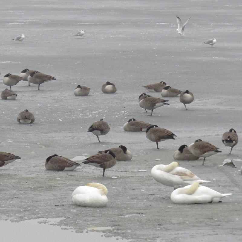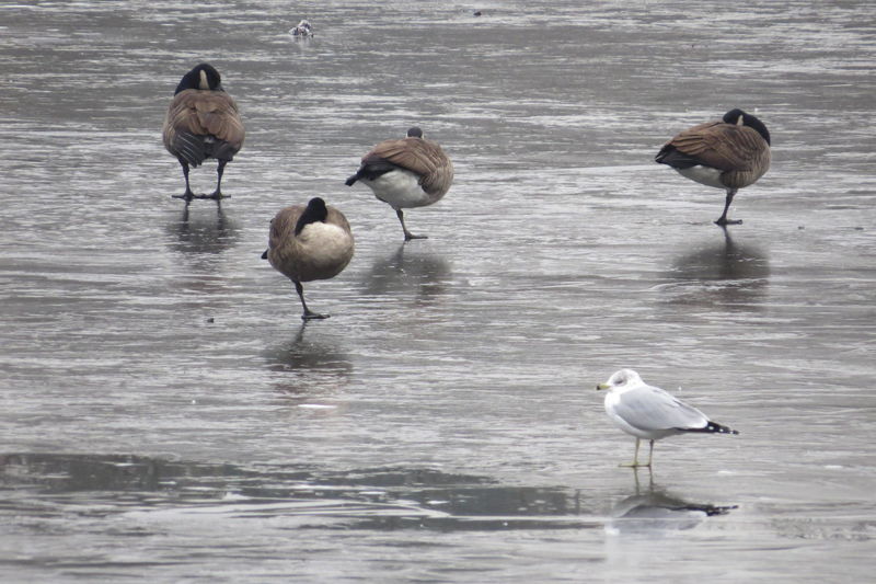 Ring-billed gull Published by E Springer, December 16th, 2014 Although it’s called the ring-billed gull, the wingtips are the most striking feature of this bird. In the icy season, swans, geese, and gulls seem content to share the pond peacefully.