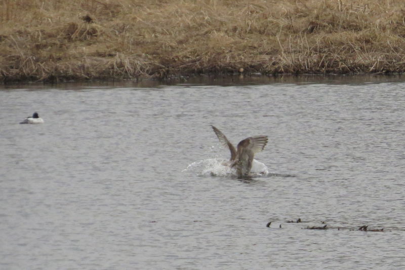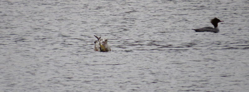 This is probably an immature herring gull passing through -- not a common sight at our millpond. Clearly, however, it’s old enough to have some impressive fishing skills (it seems to have caught a bluegill or a pumpkinseed at middle right). It looked a bit like a giant hummingbird with its eye on the fish below water. The merganser seems mildly interested, certainly not worried, to share the water with the larger gull.